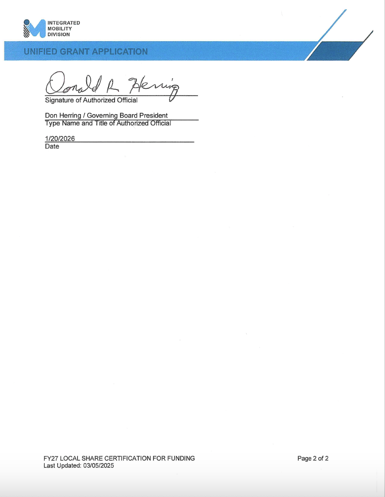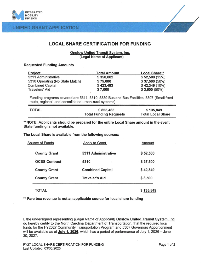 A correction has been made to the 5311 Administrative Program Local Share Certificate for the FY27 Unified Grant Application. A $2,971 increase was identified in the 5311 Administrative Program local share funding amount. Onslow United Transit has completed all required updates in accordance with NCDOT-IMD guidance, and an additional public hearing is not required.
